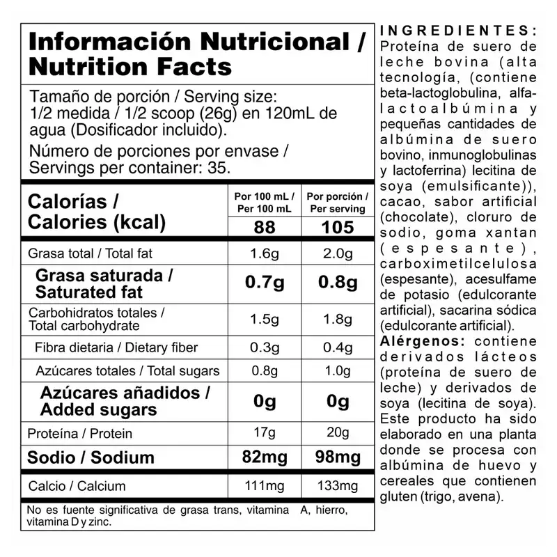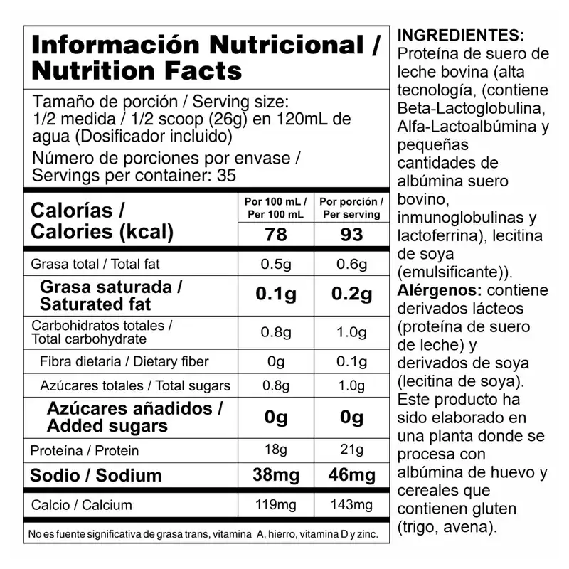 Proteína de suero de leche aislada, contiene 42g de proteína en 1 scoop, 180 calorias, 35 servicios, libre de carbohidratos y grasas, contiene alfa lactoalbúmina y beta lactoglobulina. Proteína de alto valor biológico.