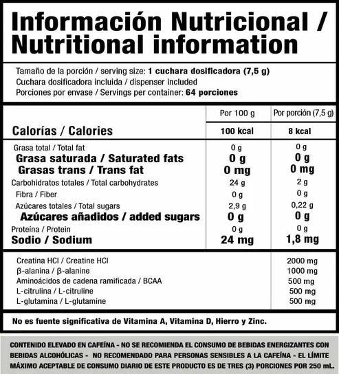 Una mezcla en polvo con sabor intenso y fácil disolución, diseñada para quienes buscan mejorar su rendimiento físico con una fórmula ligera, sin azúcar añadida y con ingredientes premium.