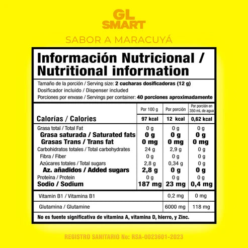 GL SMART es una mezcla en polvo sabor maracuyá que combina 6g de L-glutamina pura por porción junto con una mezcla de electrolitos esenciales que favorecen la hidratación y el balance mineral después del ejercicio. Diseñada para quienes prefieren una bebida ligera, sin azúcar añadida y con buen perfil de solubilidad.
