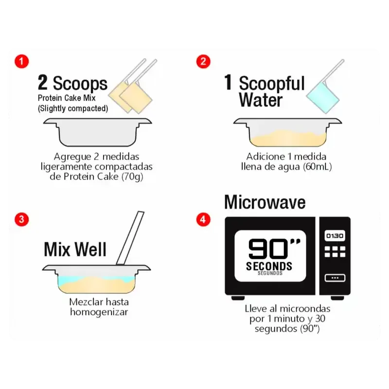 Mezcla 1 medida (55g) de Protein Cake con 90ml de agua (usa la cuchara dosificadora incluida).
