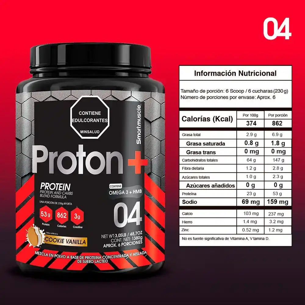 Proton + 3 Libras Smart Muscle es una proteína hipercalórica diseñada para maximizar tus resultados. Combina proteínas lácteas de alta calidad con carbohidratos provenientes de avena, arroz y maltodextrina, ofreciendo energía sostenida y soporte muscular. Su fórmula avanzada incluye Creatina Monohidrato, HMB y Omega 3, que potencian el rendimiento y aceleran la recuperación. Disfruta de su delicioso sabor Cookie Vanilla y Creamy Roll mientras impulsas tu entrenamiento y optimizas tu recuperación con cada porción. Ideal para quienes buscan un suplemento completo y efectivo.