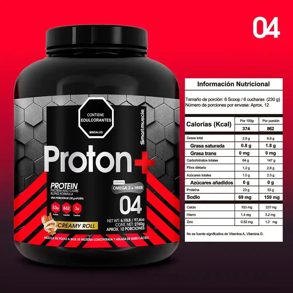 Proton + 6 Libras Smart Muscle es una proteína hipercalórica diseñada para maximizar tus resultados. Combina proteínas lácteas de alta calidad con carbohidratos provenientes de avena, arroz y maltodextrina, ofreciendo energía sostenida y soporte muscular. Su fórmula avanzada incluye Creatina Monohidrato, HMB y Omega 3, que potencian el rendimiento y aceleran la recuperación. Disfruta de su delicioso sabor Cookie Vanilla y Creamy Roll mientras impulsas tu entrenamiento y optimizas tu recuperación con cada porción. Ideal para quienes buscan un suplemento completo y efectivo.